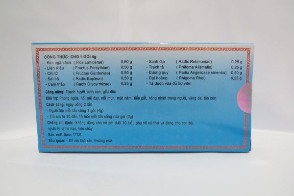 | Thành phần | Kim ngân; Liên kiều; Chi tử; Sài hồ; Cam thảo; Sinh địa; Trạch tả; Đương quy; Đại hoàng; Tá dược. |